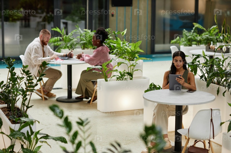 Бизнесмены, работающие за столами в кафе с использованием технологий
