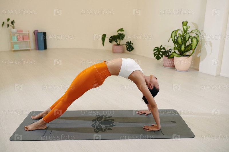 Выполнение позай Backbend Yoga в яркой, минималистической комнате