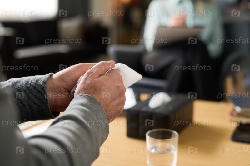 Руки пожилых людей, держащие ткань в офисной обстановке