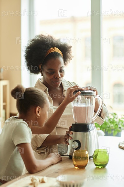 Счастливая молодая мать, делающая смузи Готовить с дочерью на кухне