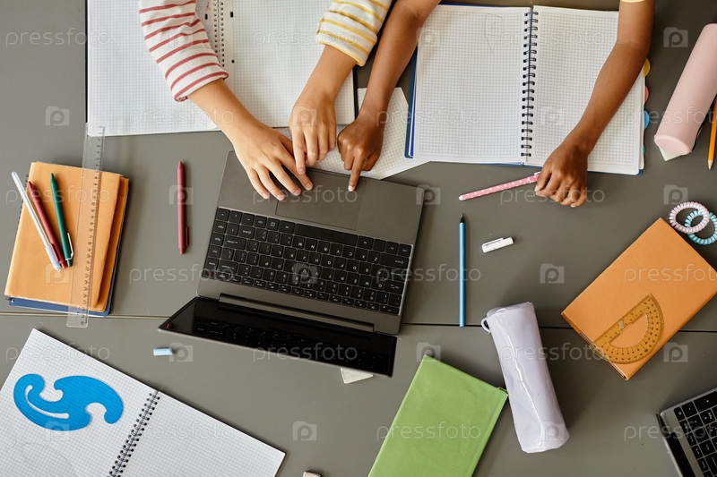 Главный вид двух детей, использующих ноутбук во время учебы за столом с канцелярскими принадлежностями