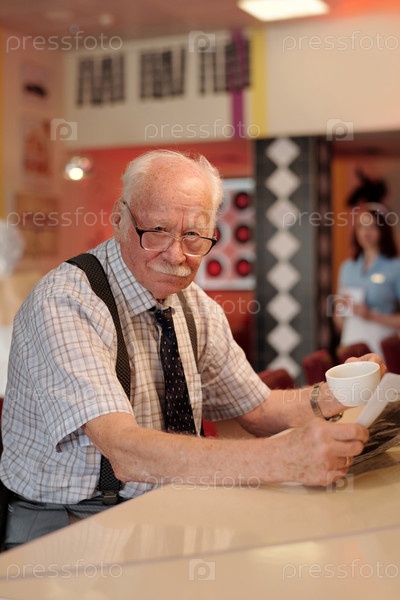 Вовлечение пожилого мужчины наслаждается кофе на уютном кафе
