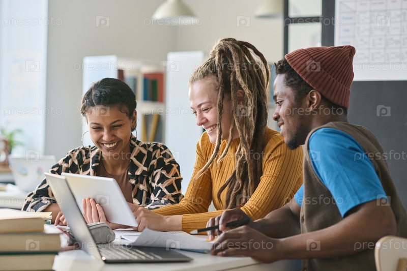 Мультиэтническая группа студентов, использующих цифровые планшеты в учебе