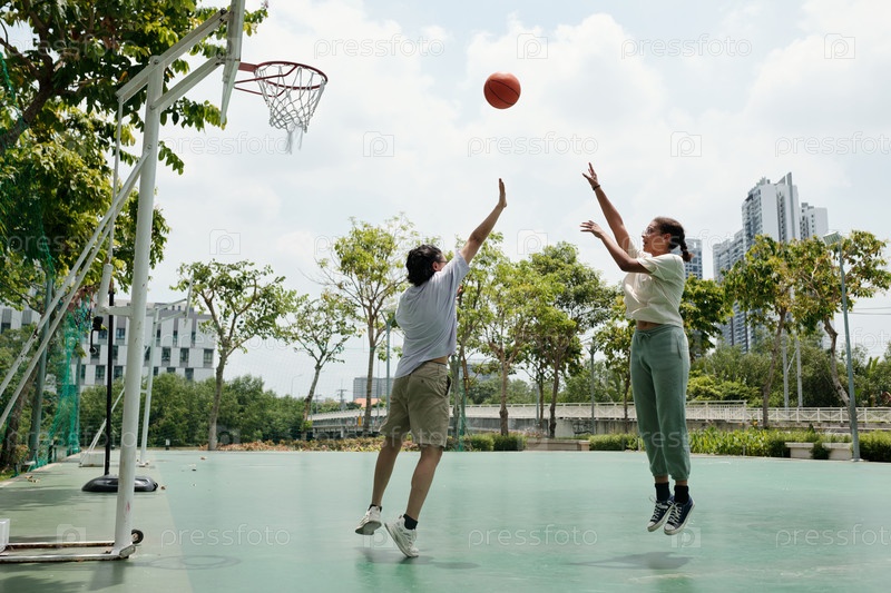 Играть в баскетбол на свежем воздухе в городском парке в солнечный день