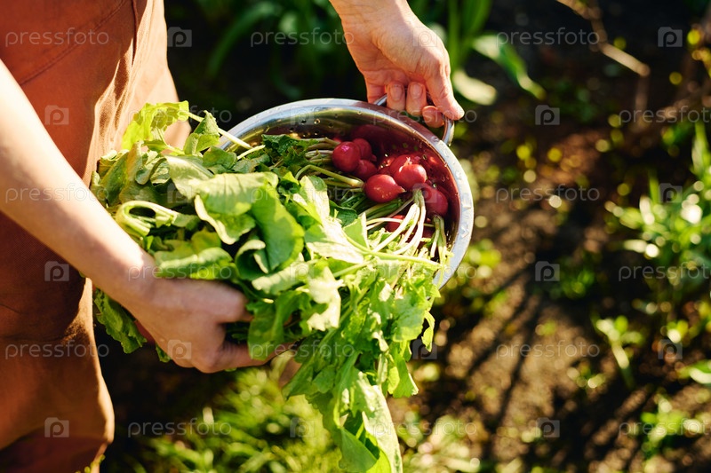 Фермер, несущий металлическую миску с редисом