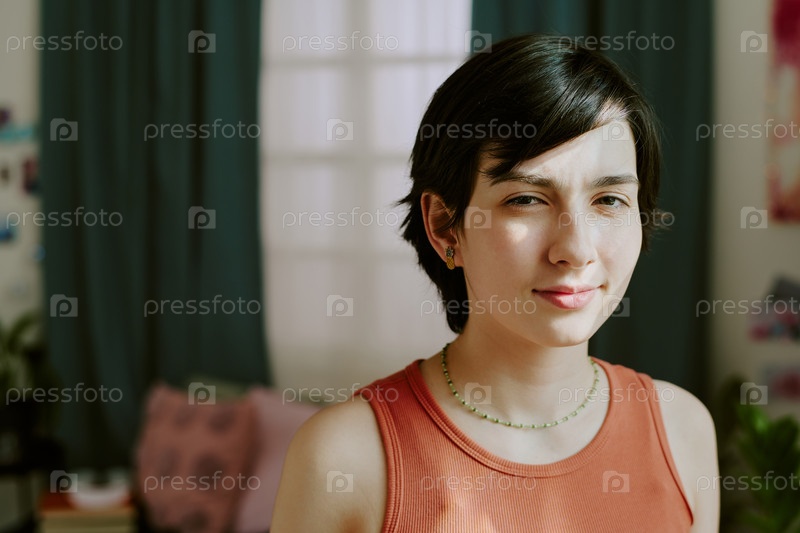 Портрет молодой женщины в уютной комнате с мягким освещением