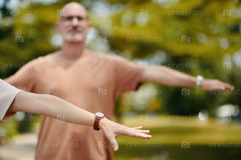 Практика распростертых рук в окружении парка на открытом воздухе