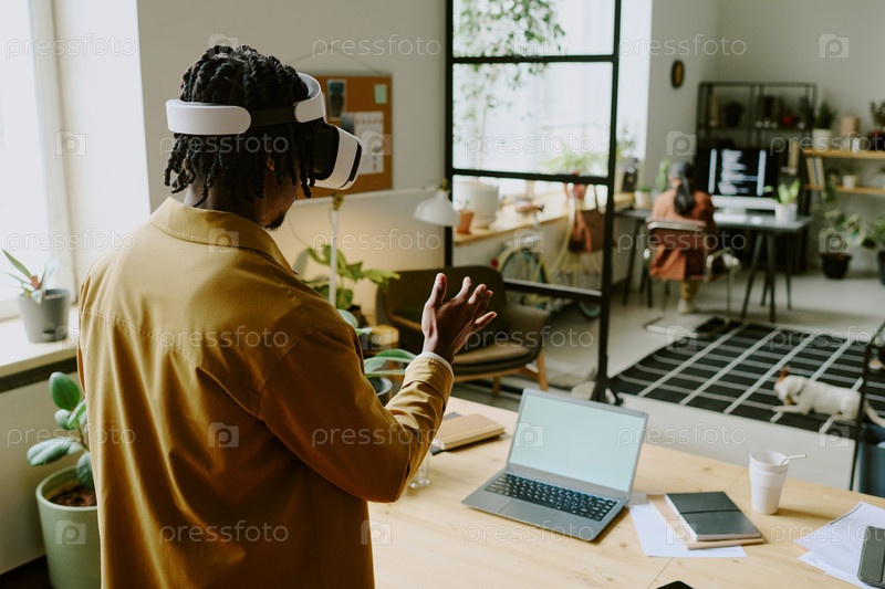 Черный человек тестирует приложение VR в современном офисе