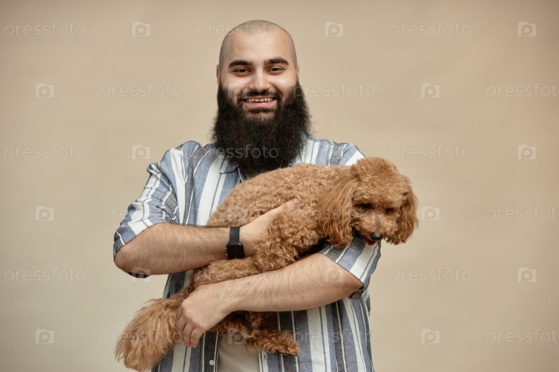 Человек, держащий золотой пудель и счастливо улыбающийся перед камерой