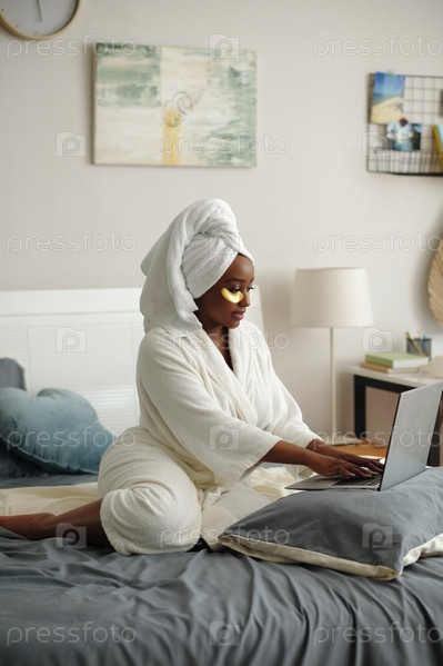 Расслабляющая женщина в халате с помощью ноутбука на кровати