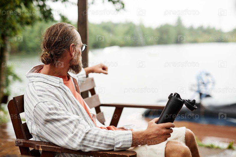Обратный взгляд на человека, отдыхающего на террасе с видом на озеро