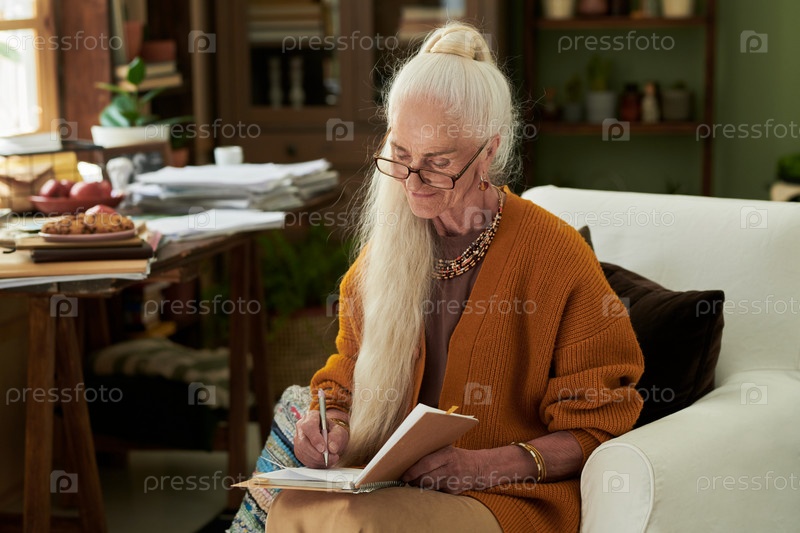 Пожилая женщина пишет в уютной гостиной