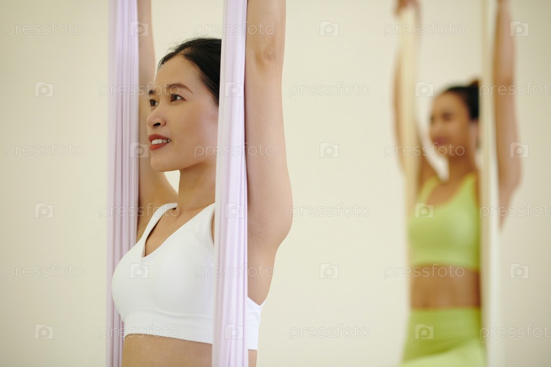 Улыбающаяся женщина занимается воздушными упражнениями йоги