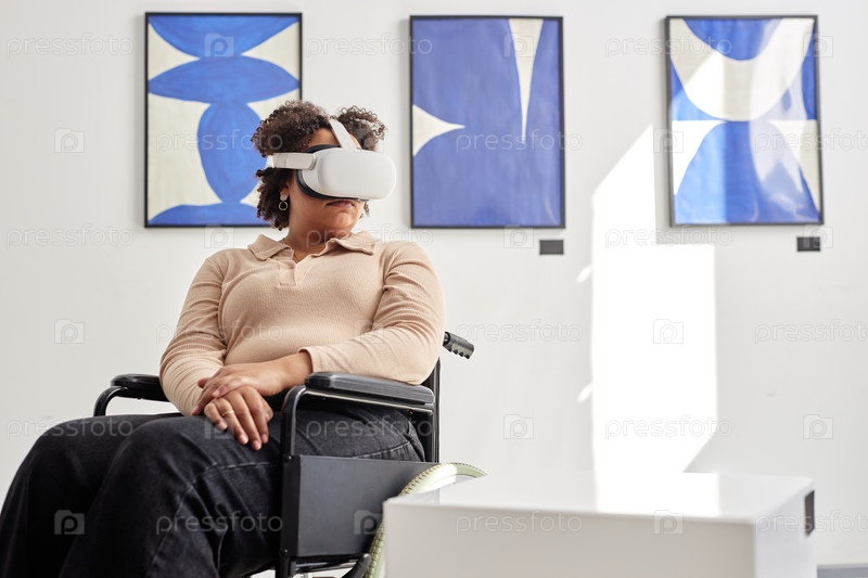 Чернокожая женщина с инвалидностью использует VR в музее