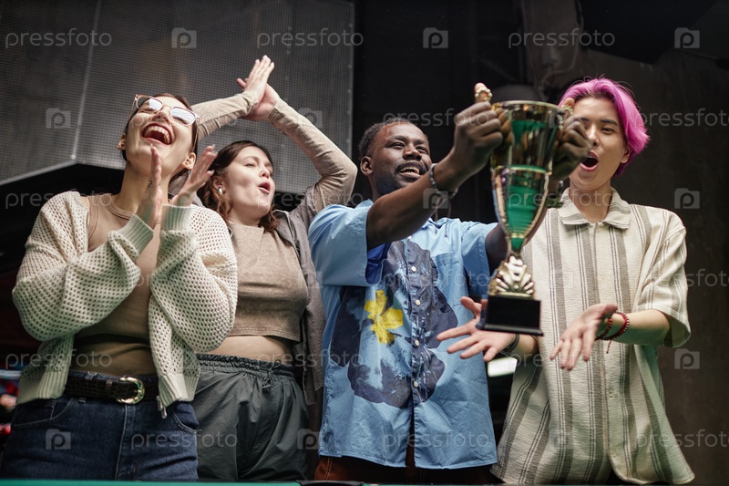 Празднование Победы, удерживая трофей в уютной помещенной обстановке