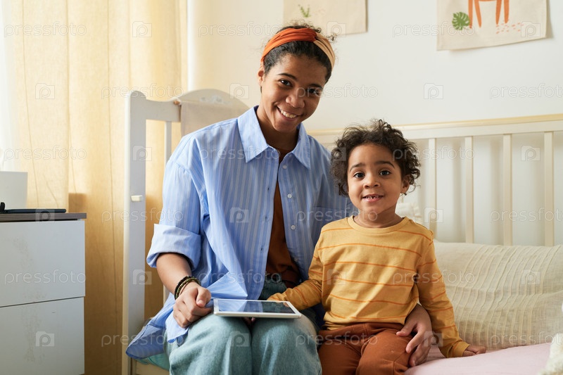 Улыбающаяся мать держит планшет рядом с ребенком в спальне