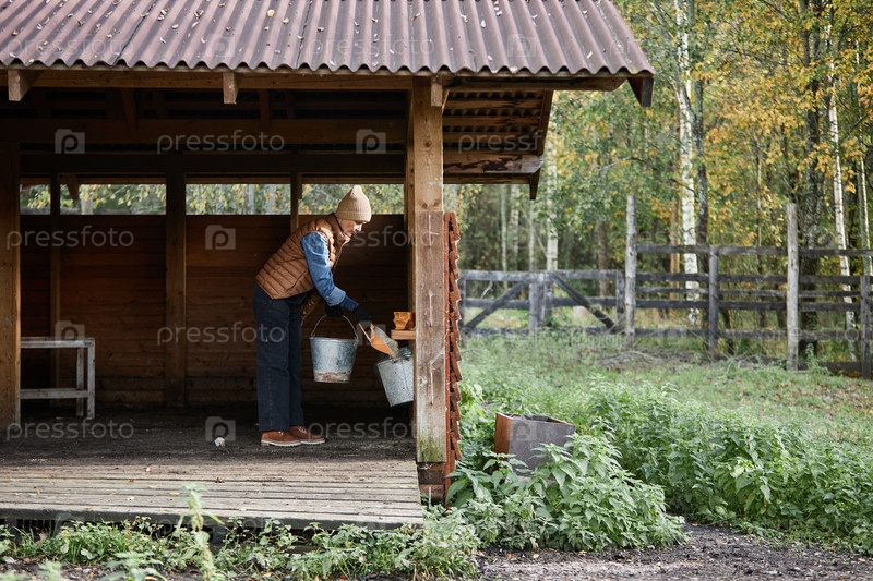 Женщина-фермер в теплой одежде, держащая ведро в сарае на ферме