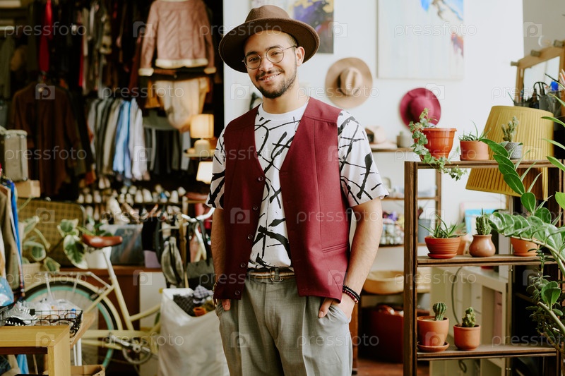Улыбающийся мужчина в магазине одежды с горшковыми растениями
