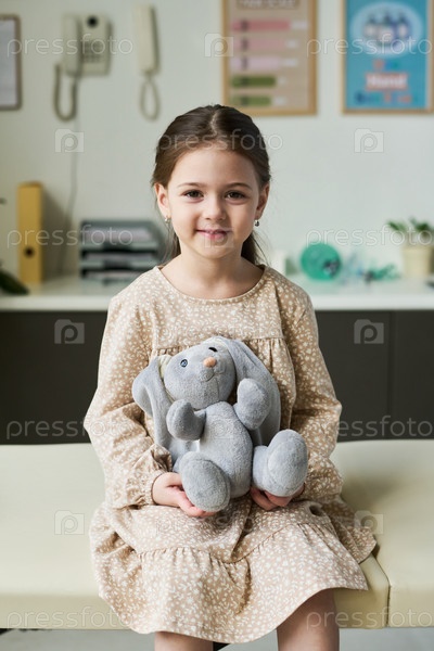 Портрет улыбающейся девочки, держащей набитого животного в больничной комнате
