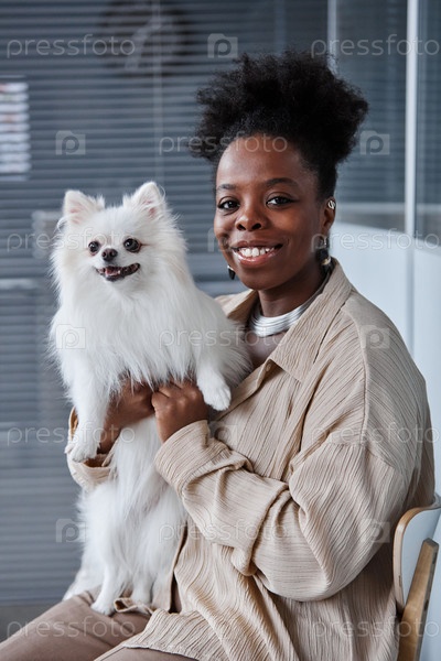 Портрет чернокожей женщины с щенком у врачей