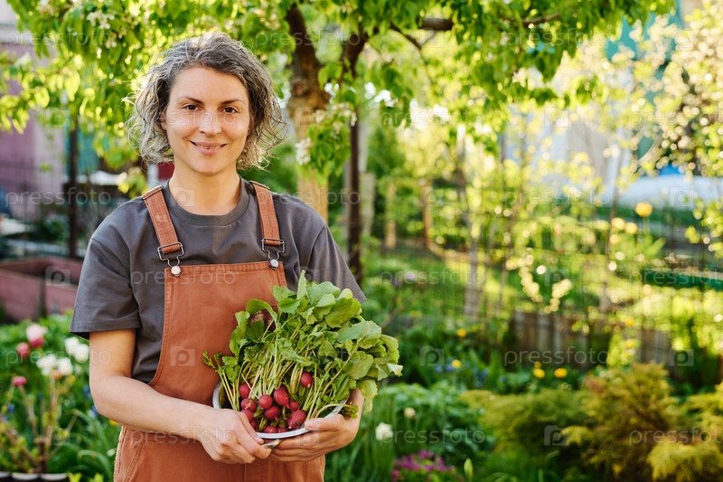 Улыбающийся фермер с урожаем редисок