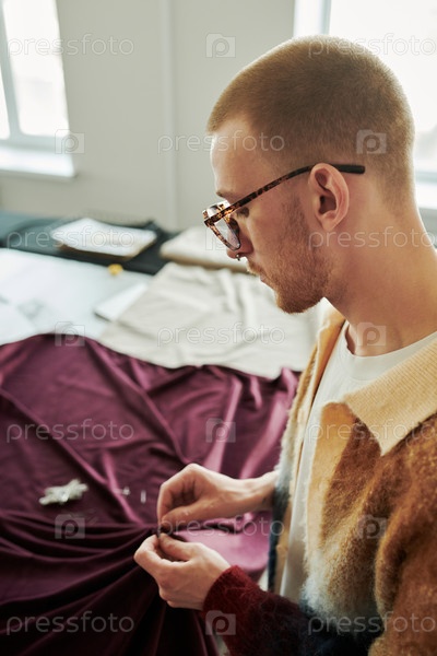 Мужчина шьет части текстиля вместе