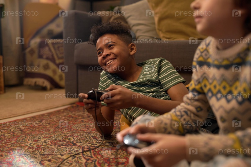 Улыбающийся афроамериканский мальчик играет в видеоигры с другом