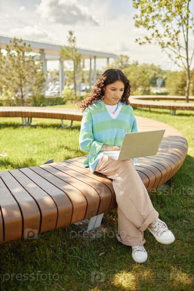 Мультиэтническая девочка-подросток с помощью ноутбука учится снаружи на скамейке