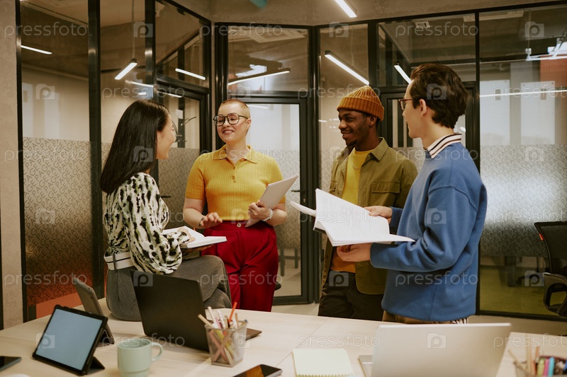Группа разнообразных молодых бизнесменов, обсуждающих проект