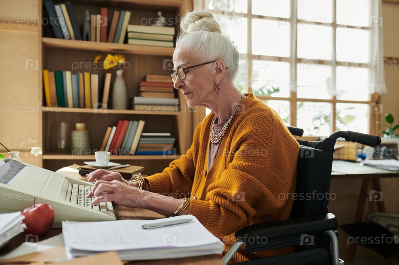 Пожилая женщина использует пишущую машину в уютной офисной обстановке