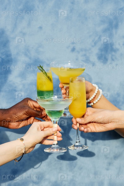 Празднование цветными коктейлями на синем фоне