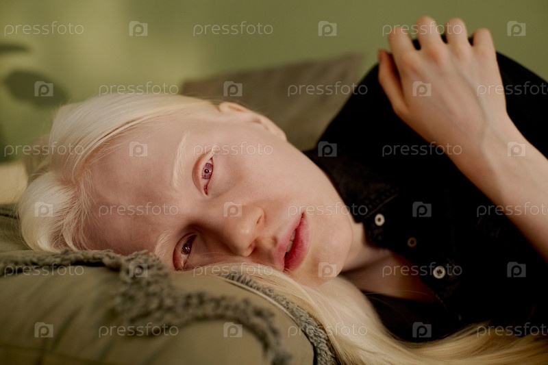 Молодая женщина с белыми волосами лежит на диване