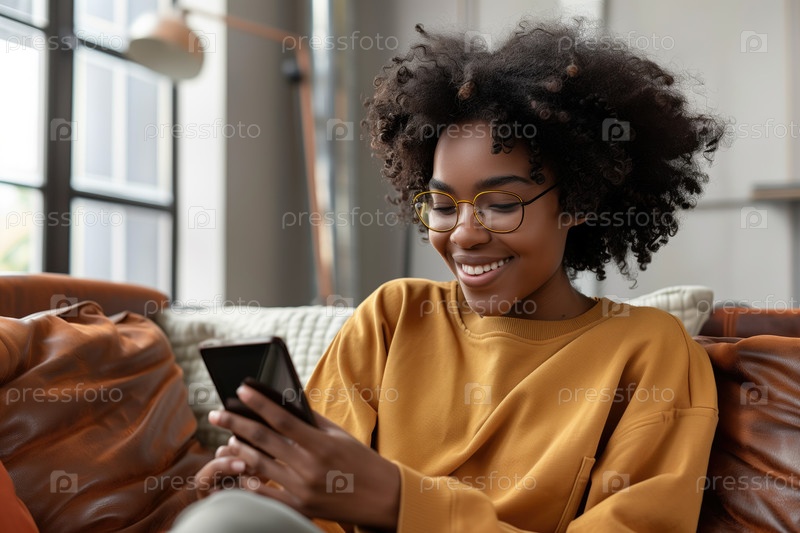 Улыбающаяся женщина читает сообщение на смартфоне в уютной комнате