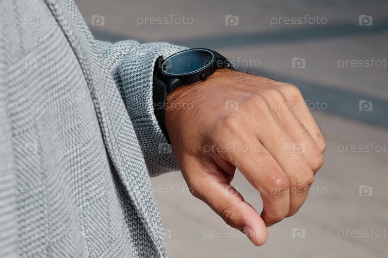 Ближайшее изображение руки, носящей элегантные умные часы