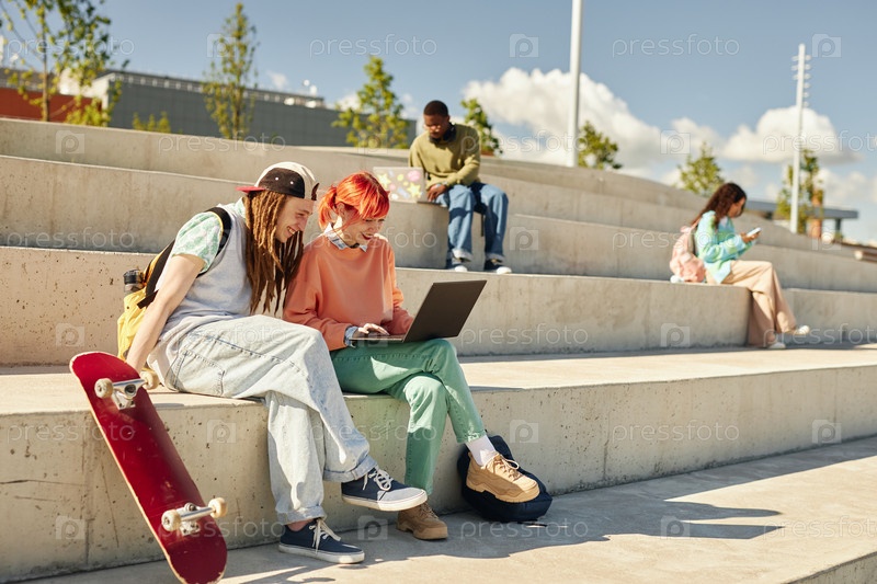 Улыбающийся мальчик-подросток и девочка веселятся, используя ноутбук на скамейке в парке