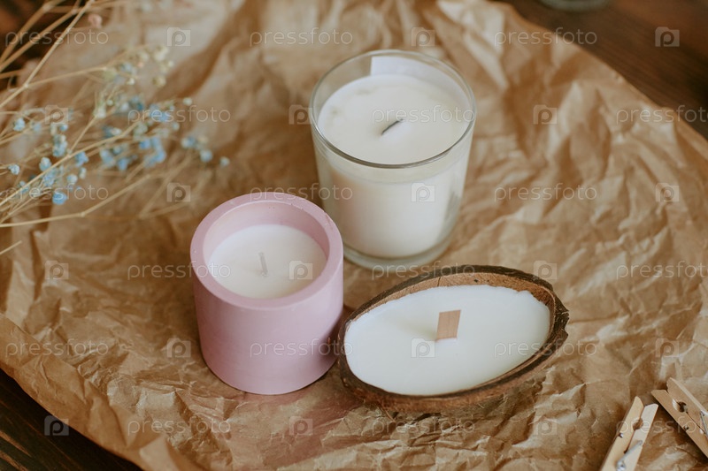 Выставка различных ароматных свечей в разных держателях