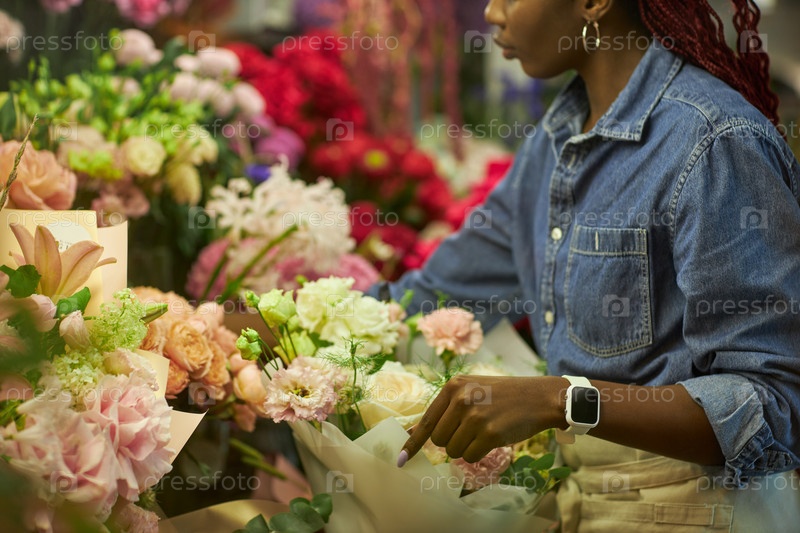 Флорист, устраивающий цветочную экспозицию