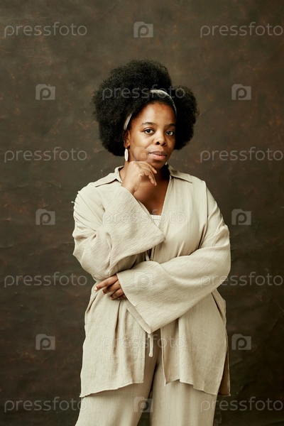 Вдумчивая чернокожая женщина в бежевой одежде смотрит на камеру на коричневом фоне