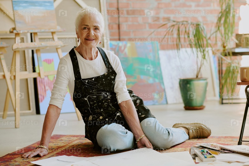 Креативная бабушка, сидящая на полу