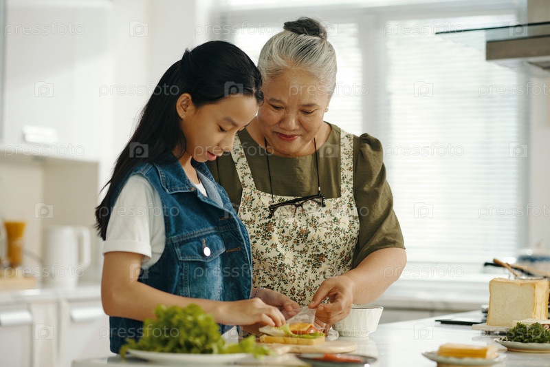 Девочка, готовящая бутерброд с бабушкой