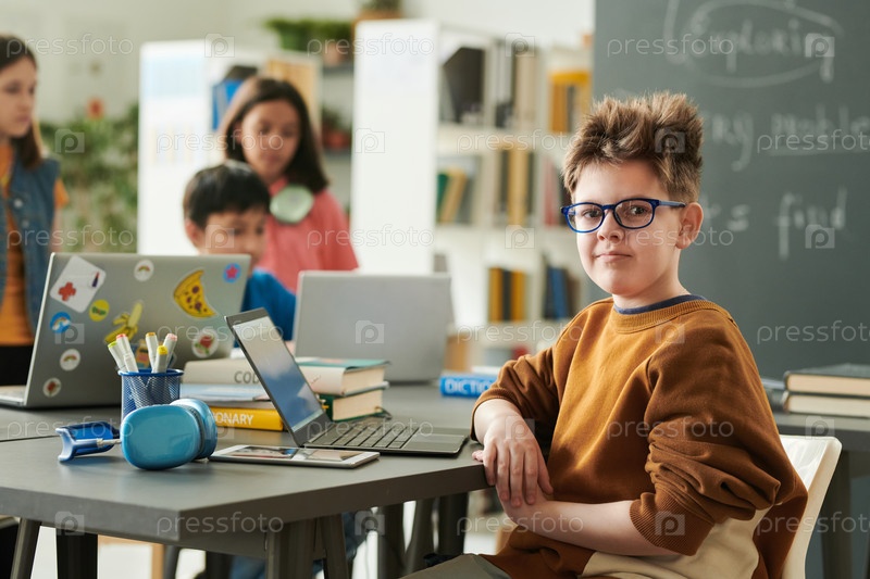 Смотрящий на камеру в классе компьютеров мальчик