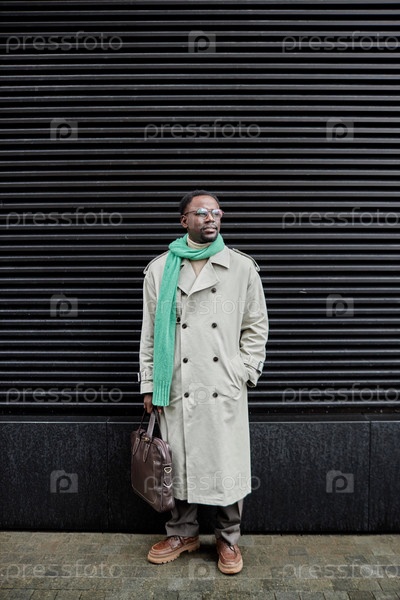 Стоящий мужчина с зеленым шарфом, держащий коричневую сумку