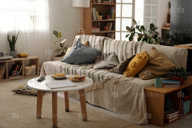 Диван и стол с фаст-фудом