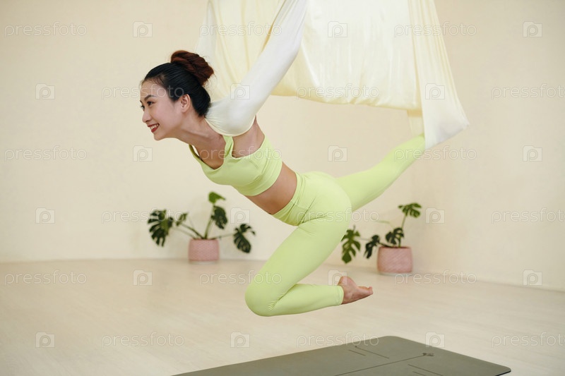 Улыбающаяся женщина практикует воздушную йогу на гамаке