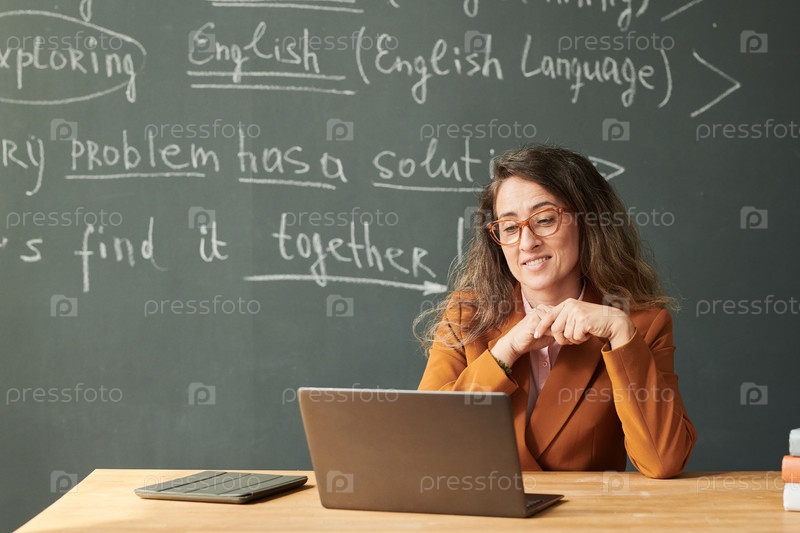 Учитель смотрит на экран ноутбука в школе
