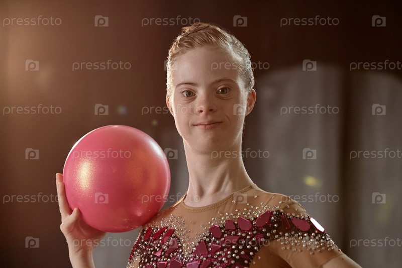 Портрет улыбающейся гимнастки, держащей блестящий красный мяч