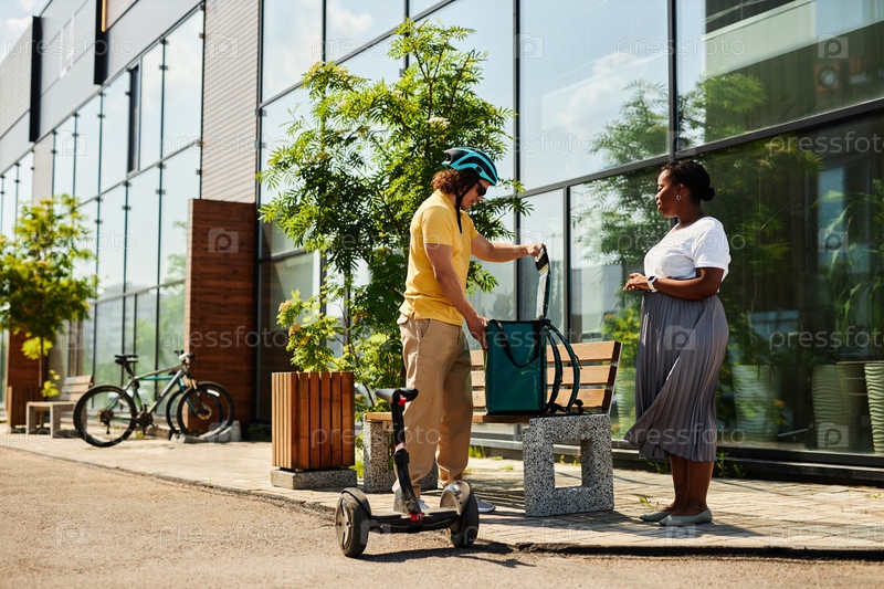 Доставка пакета с помощью электрического скутера за пределами современного здания