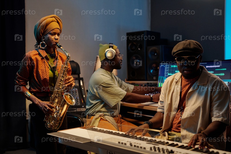 Создание музыки в студии звукозаписи с помощью саксофона и клавиатуры