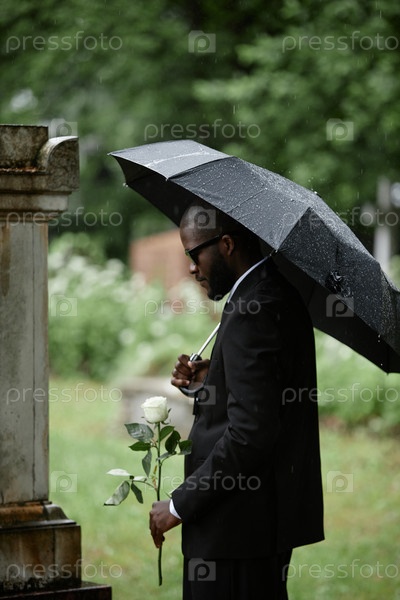 Чернокожий мужчина скорбит рядом с могилой, держа розу под зонтиком на кладбище