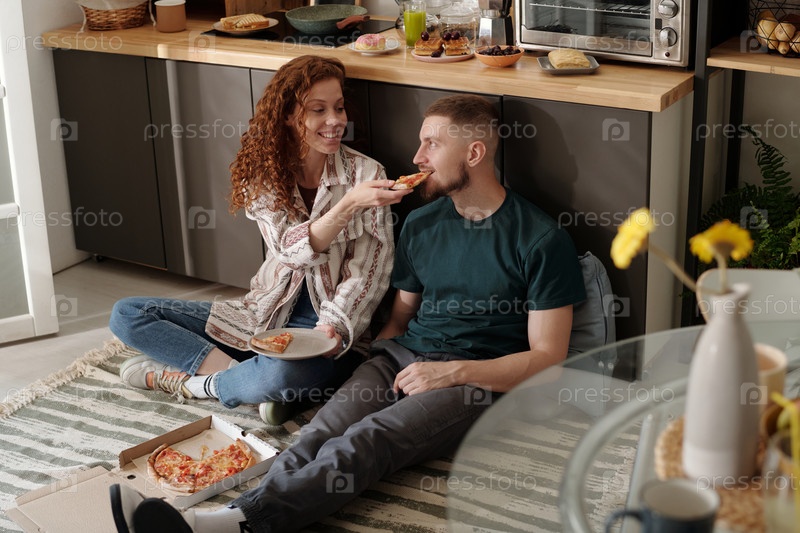 Девушка делится вкусной пиццей с парнем